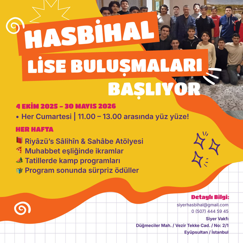 Hasbihâl lise uluşmalarımız 4 Ekim’de başlayarak 30 Mayıs 2026 tarihine kadar sürecek ve her Cumartesi günü 11.00-13.00 arası Siyer Vakfı binamızda gerçekleştirilecek.